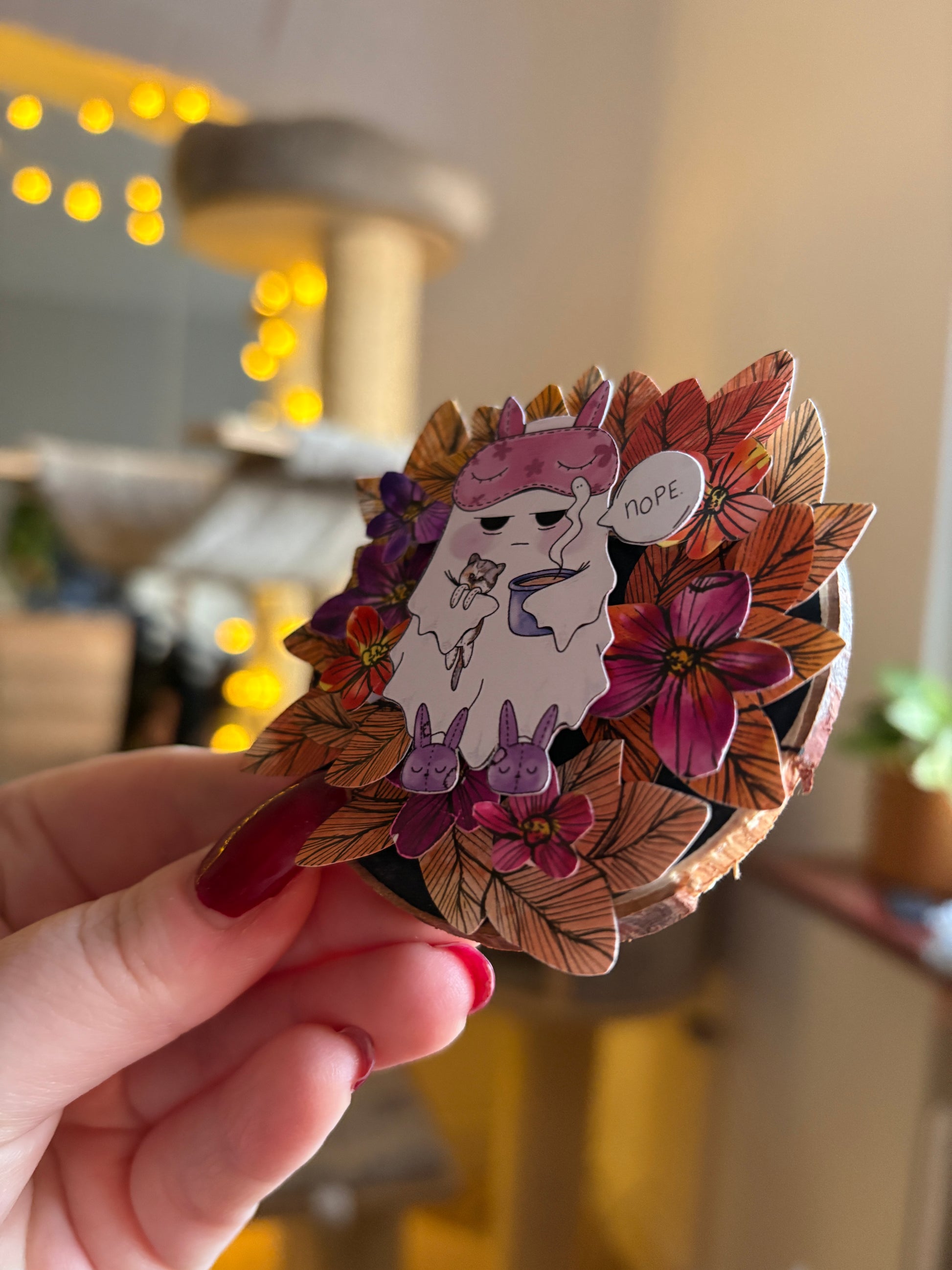 Dieser liebevoll gestaltete Kühlschrankmagnet bringt Pop-Up-Kunst in den Alltag. Das kleine, süße Motiv in der Mitte und Blüten und Blätter drumherum.