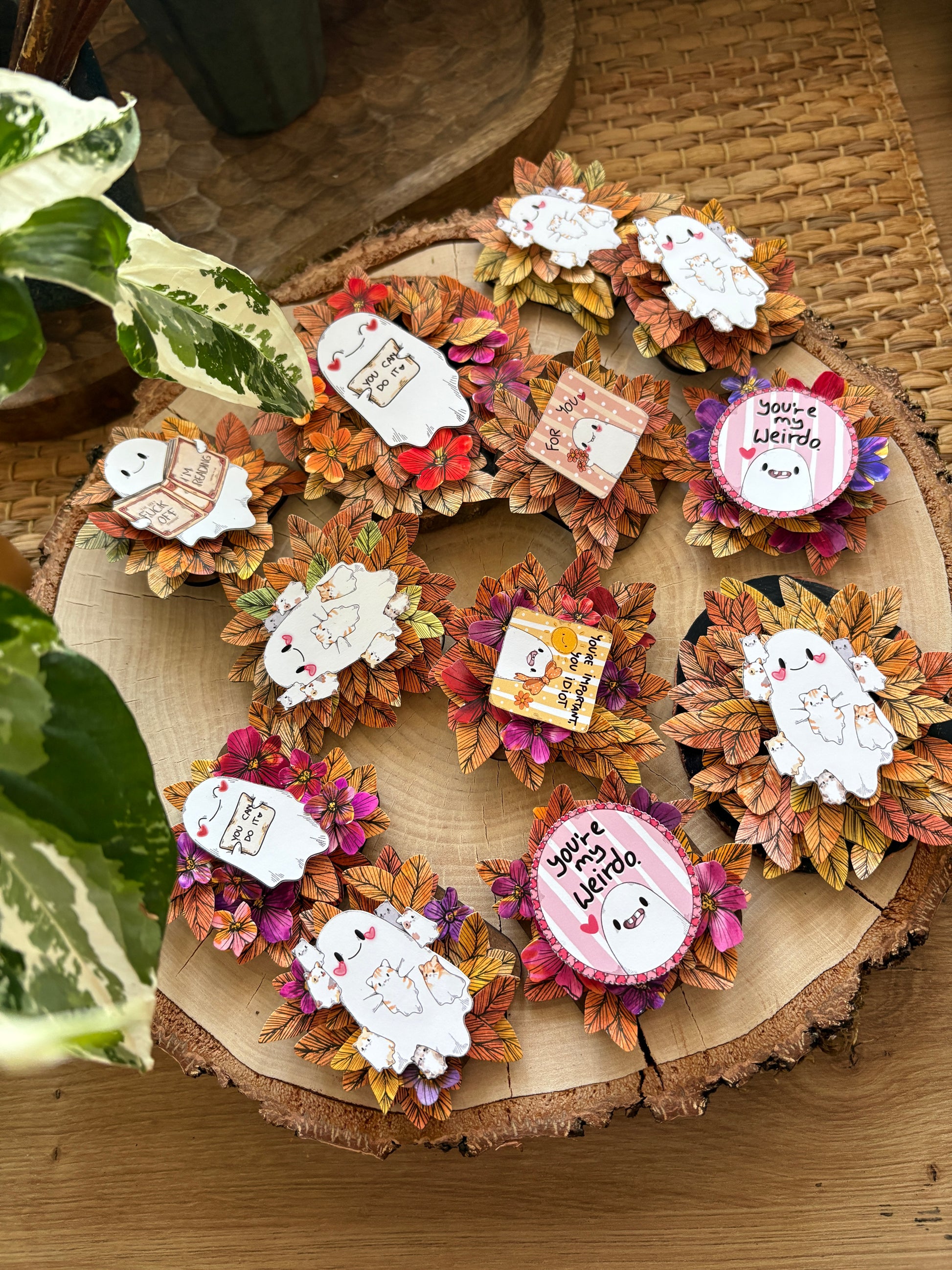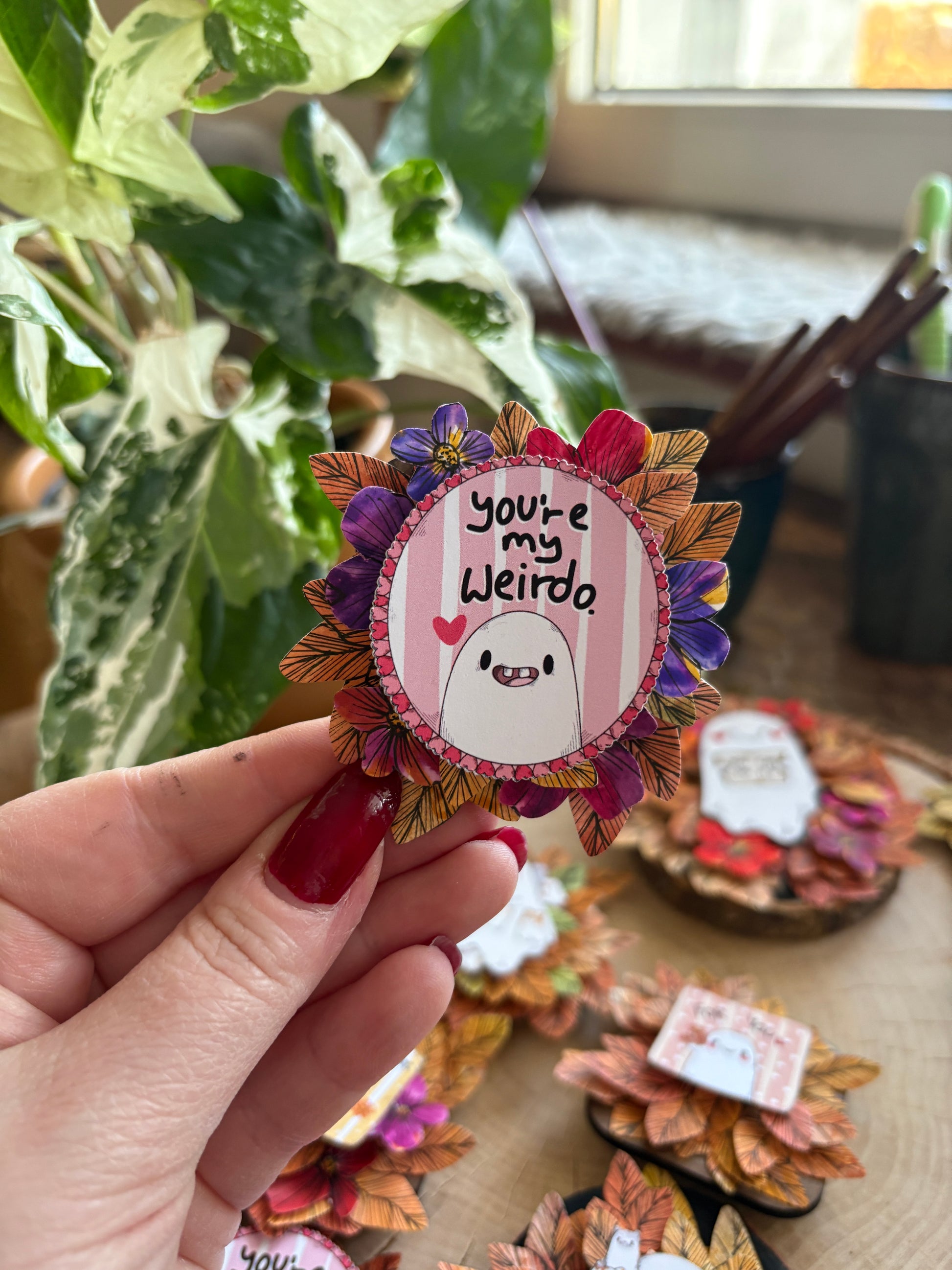 Dieser liebevoll gestaltete Kühlschrankmagnet bringt Pop-Up-Kunst in den Alltag. Das kleine, süße Motiv in der Mitte und Blüten und Blätter drumherum.