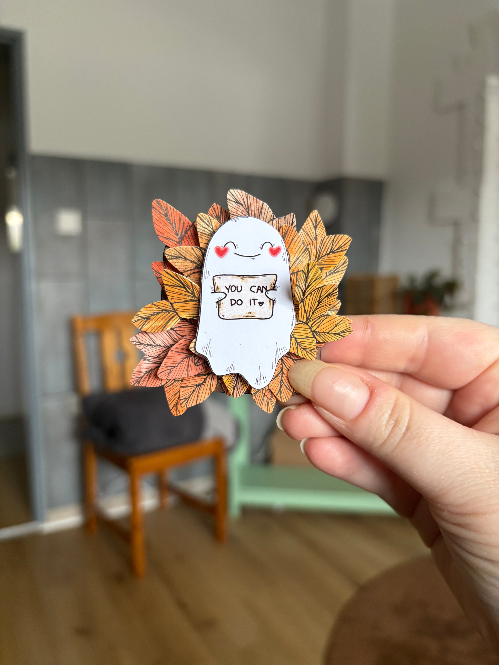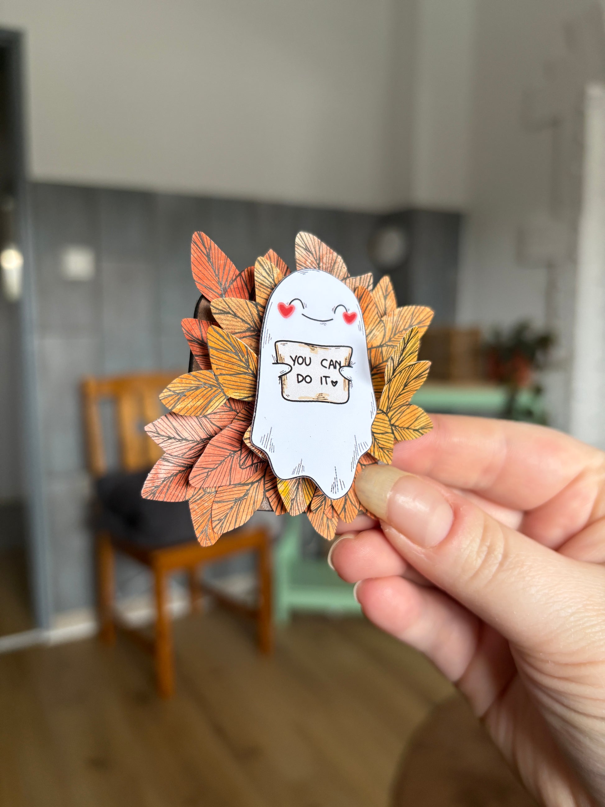 Dieser liebevoll gestaltete Kühlschrankmagnet bringt Pop-Up-Kunst in den Alltag. Das kleine, süße Motiv in der Mitte und Blüten und Blätter drumherum.