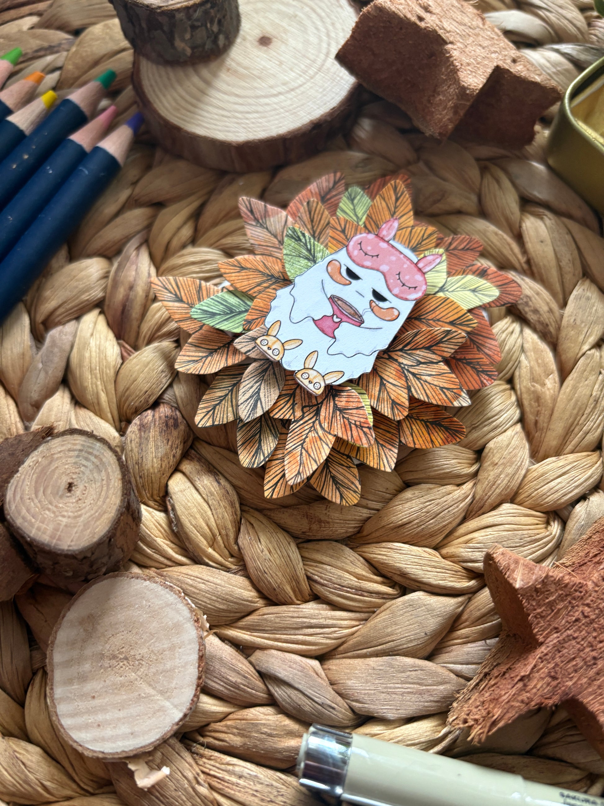 Jedes einzelne Blatt, welches das Schwarz/Weiße Lineart umgibt, wird per Hand hergestellt. Es werden Papierbögen coloriert, viele kleine Blätter drauf gezeichnet, diese werden detailliert mit feinsten Strichen und per Hand Stück für Stück ausgeschnitten.
