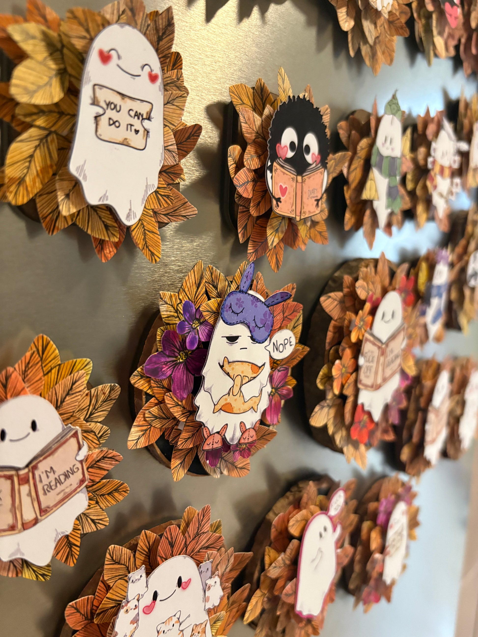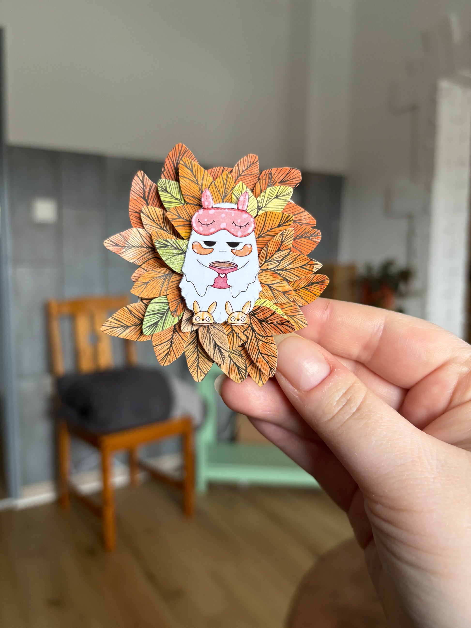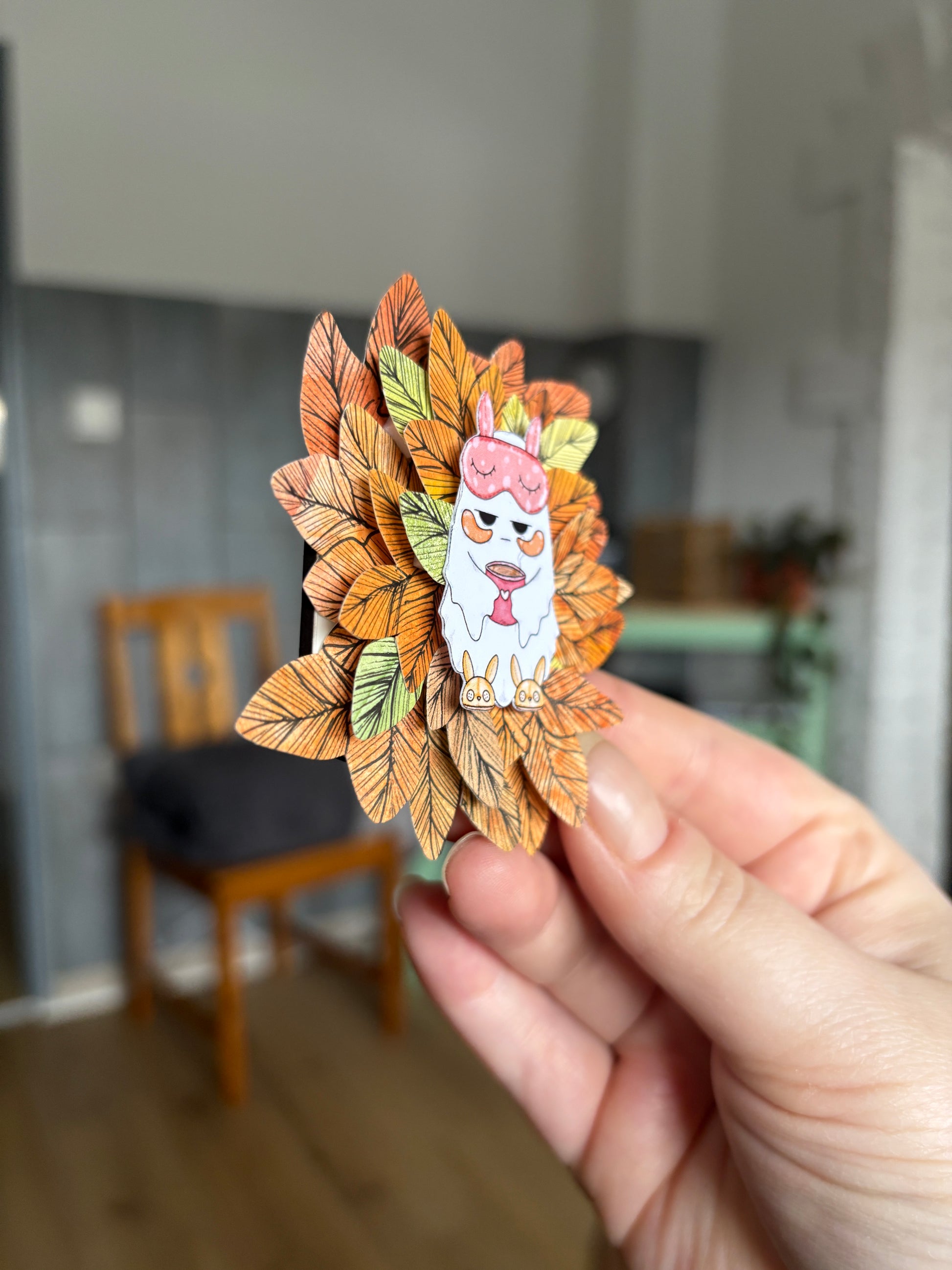 Dieser liebevoll gestaltete Kühlschrankmagnet bringt Pop-Up-Kunst in den Alltag. Das kleine, süße Motiv in der Mitte und Blüten und Blätter drumherum.