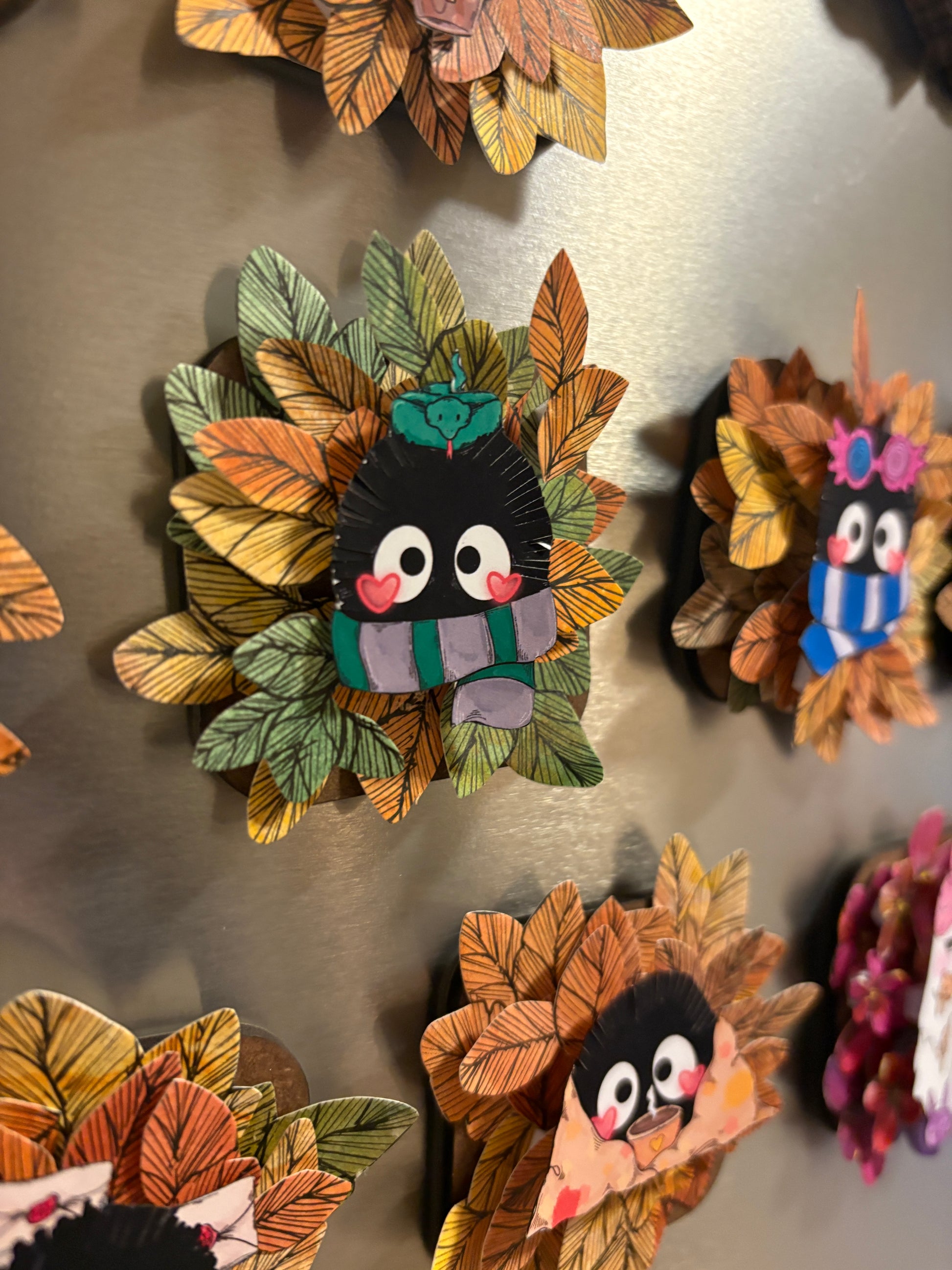 Dieser liebevoll gestaltete Kühlschrankmagnet bringt Pop-Up-Kunst in den Alltag. Das kleine, süße Motiv in der Mitte und Blüten und Blätter drumherum.